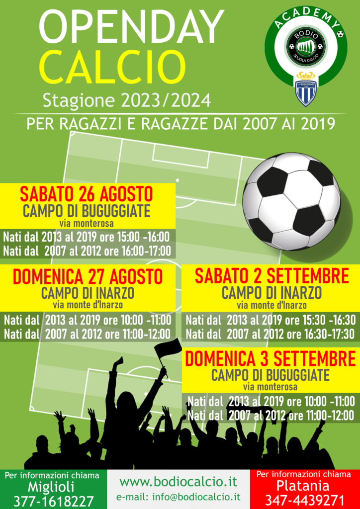Per la nuova stagione la società ha definito le date per incontrare i nuovi giovani calciatori che vogliono provare il gioco del calcio. Nella locandina troverete le date per i campi di Buguggiate e Inarzo. Per tutte le informazioni potete contattare i dirigenti Miglioli e Platania che saranno felici di rispondere ai vostri quesiti. Vi aspettiamo !!!